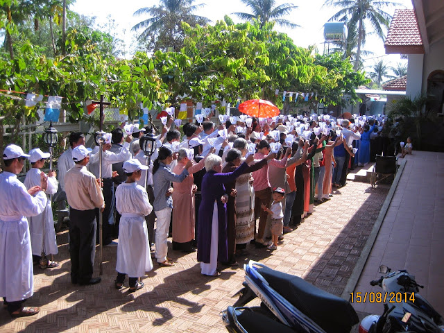 18h30 Thánh lễ vọng mừng kính Mẹ hồn xác lên trời, ngay sau lễ là kiệu tôn vinh Mẹ vòng quanh nhà thờ, giáo dân mỗi người cầm trên tay, ánh nến lung linh huyền ảo, nhìn đoàn người đi nghiêm trang tay cầm nến dâng mẹ, những ngọn nến cháy sáng cùng dâng lên Mẹ lời hát: “Hoa muôn sắc con dâng trước tòa, mầu tươi tắn hương ngát tốt xinh. Hoa muôn sắc con dâng trước tòa, còn thua kém tươi Mẹ Chúa Thiên Đình”