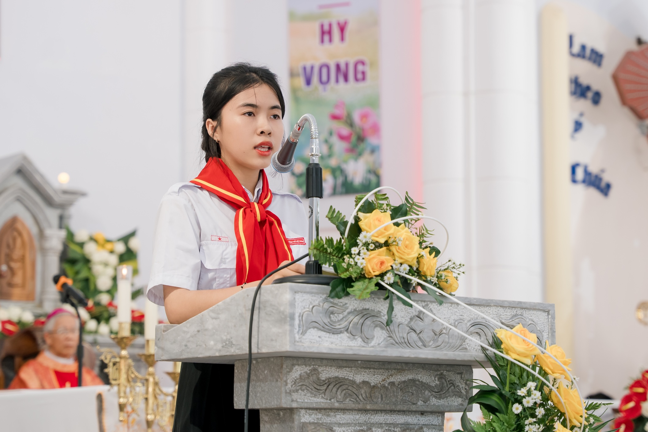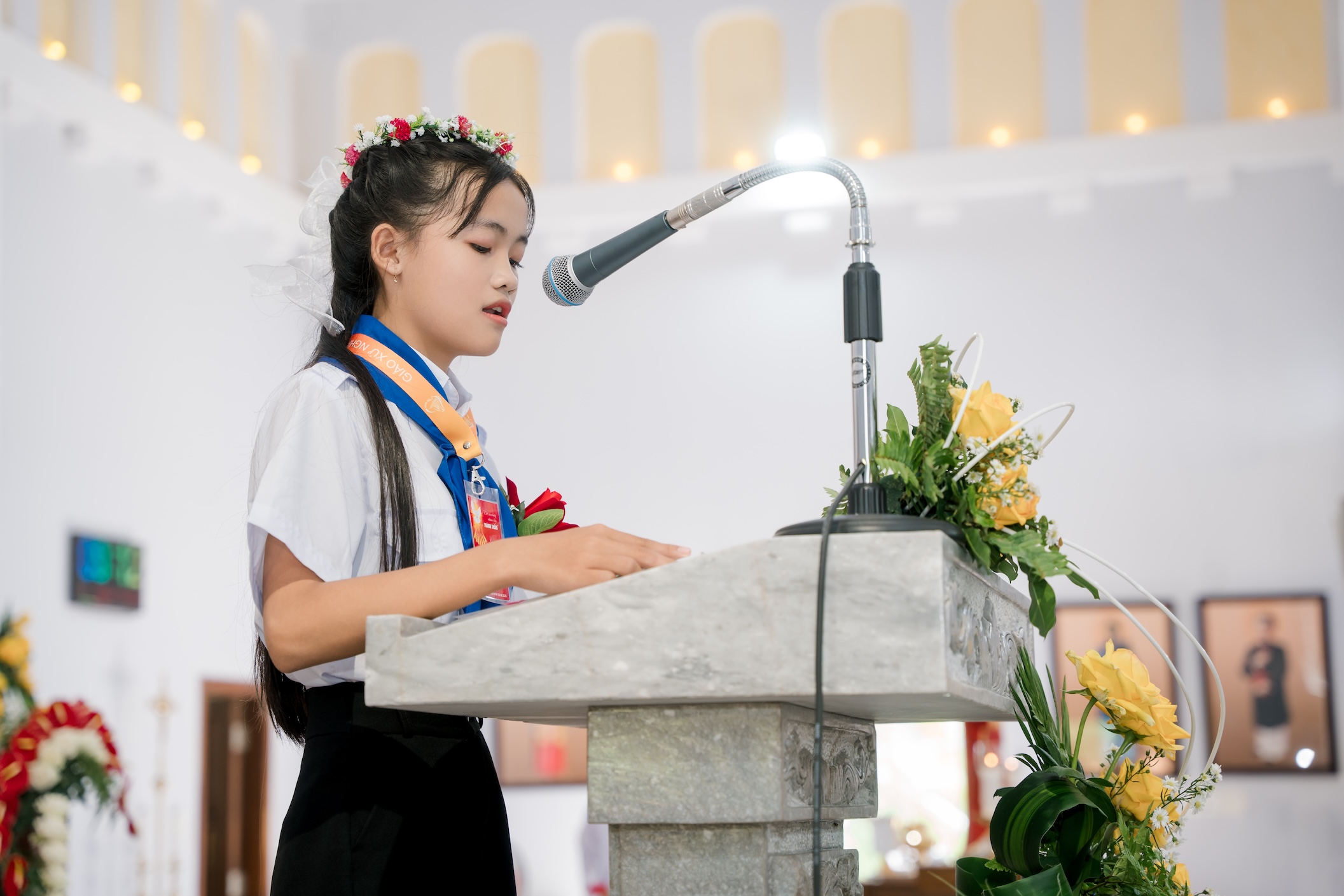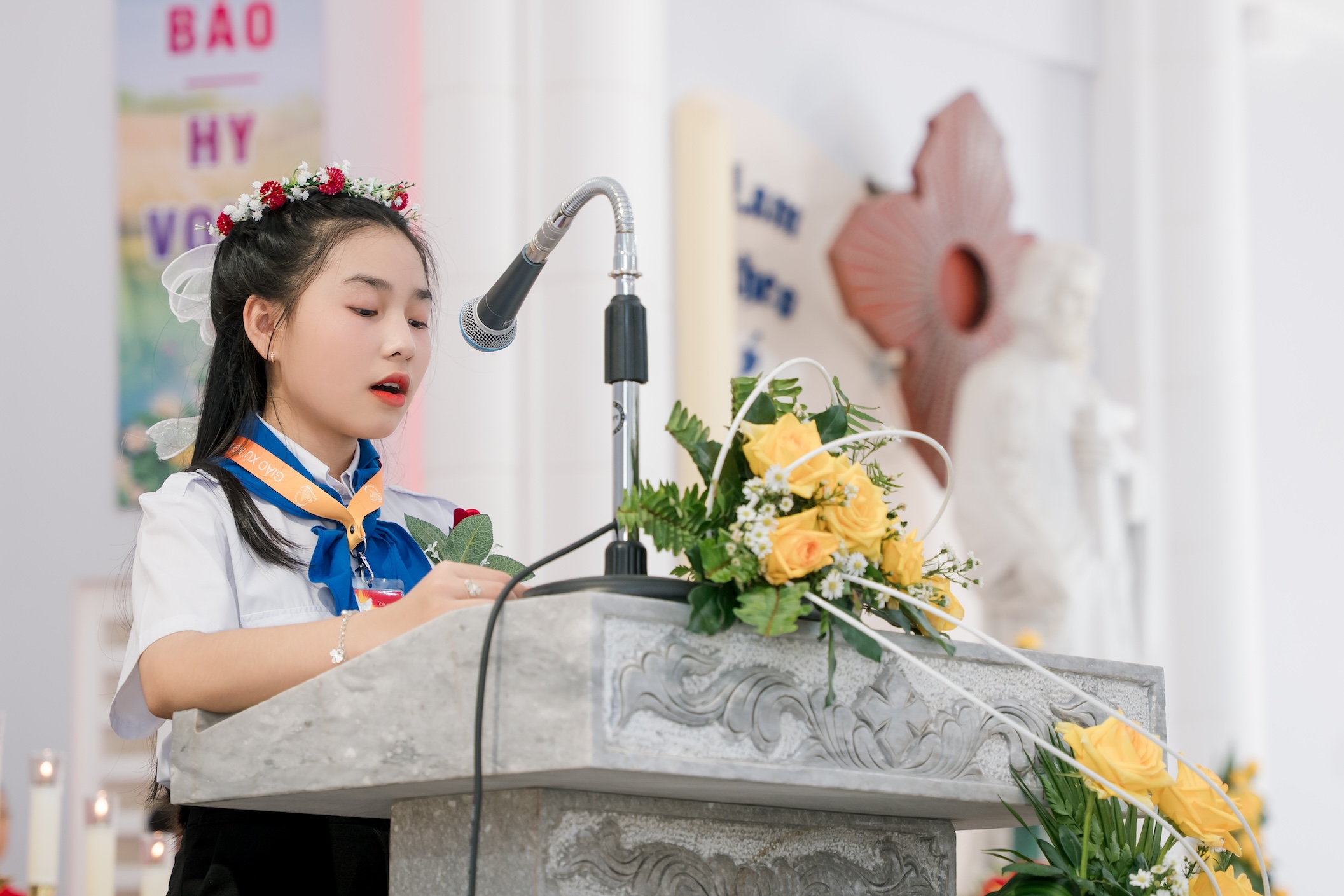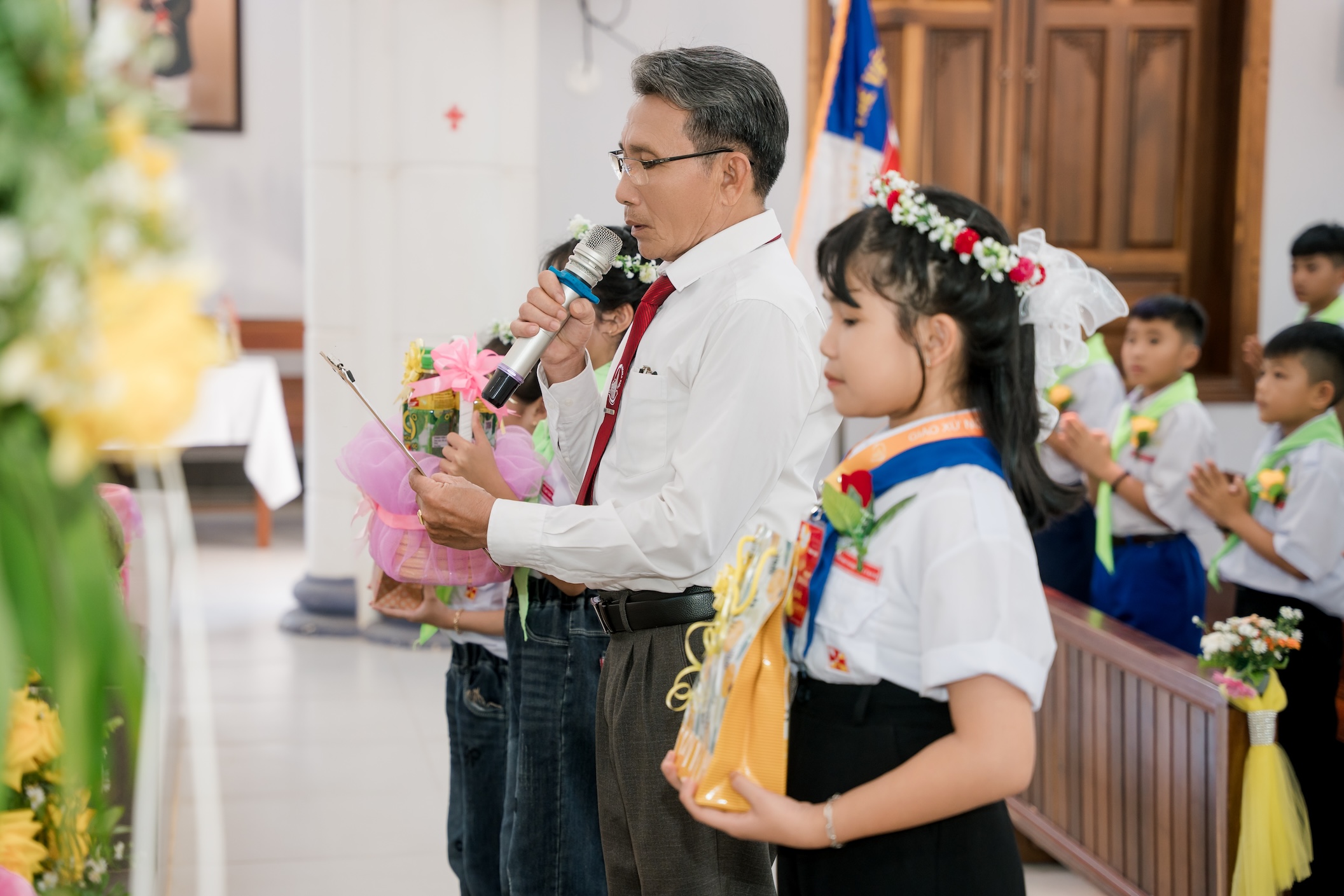 Sau thánh lễ, vị đại diện giáo xứ dâng lời tạ ơn Thiên Chúa, cảm ơn quý cha, quý sơ đã dạy dỗ, đồng hành các em trong thời gian học giáo lý thêm sức và rước lễ để các em gần Chúa hơn nữa trong các bí tích.