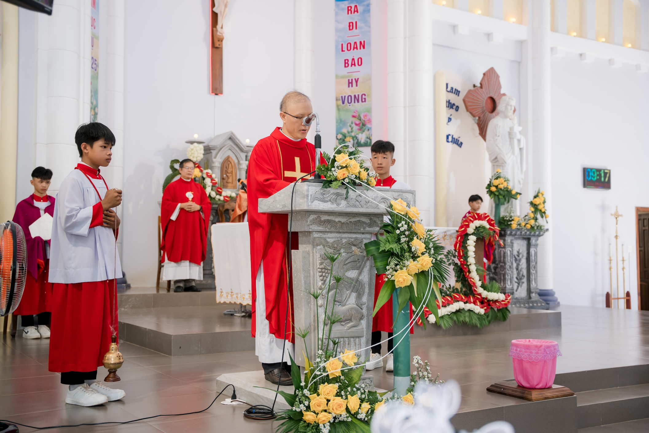 Thánh lễ do Đức Giám mục chủ tế. Đồng tế với ngài có quý cha: cha Văn phòng Tòa Giám mục, cha quản xứ Nghĩa Điền và cha Simon Trần Văn Đức. Tham dự Thánh lễ có các Sơ Dòng Nữ tỳ Chúa Giêsu Tình thương, bà con giáo dân trong và ngoài giáo xứ.