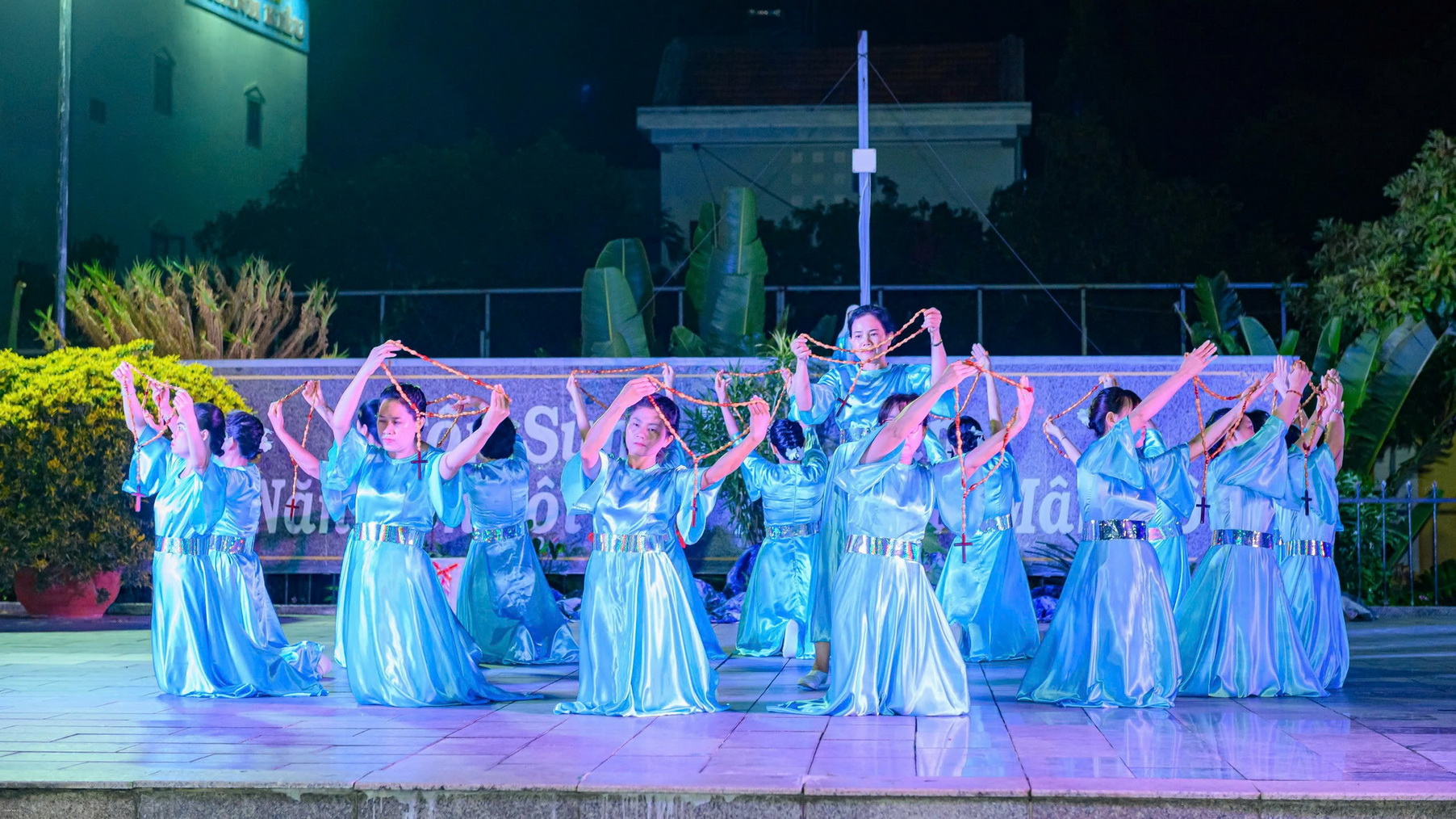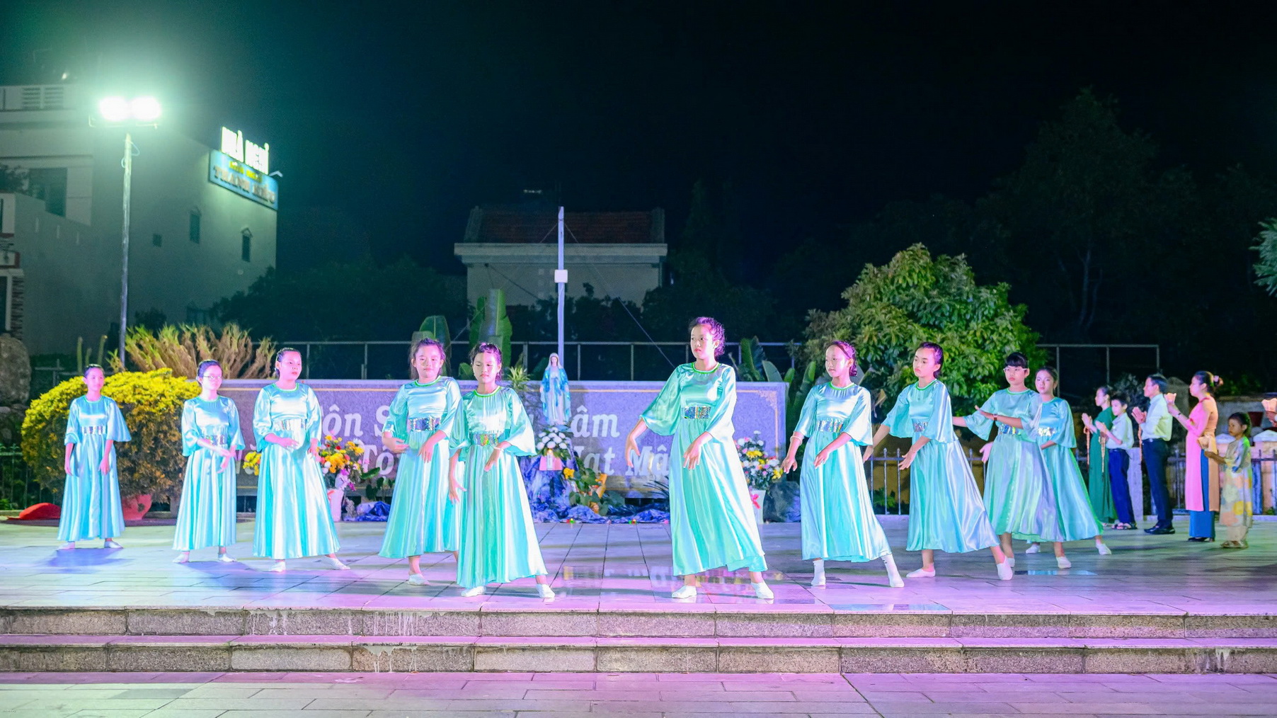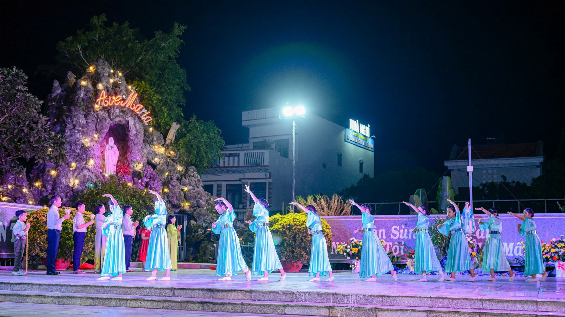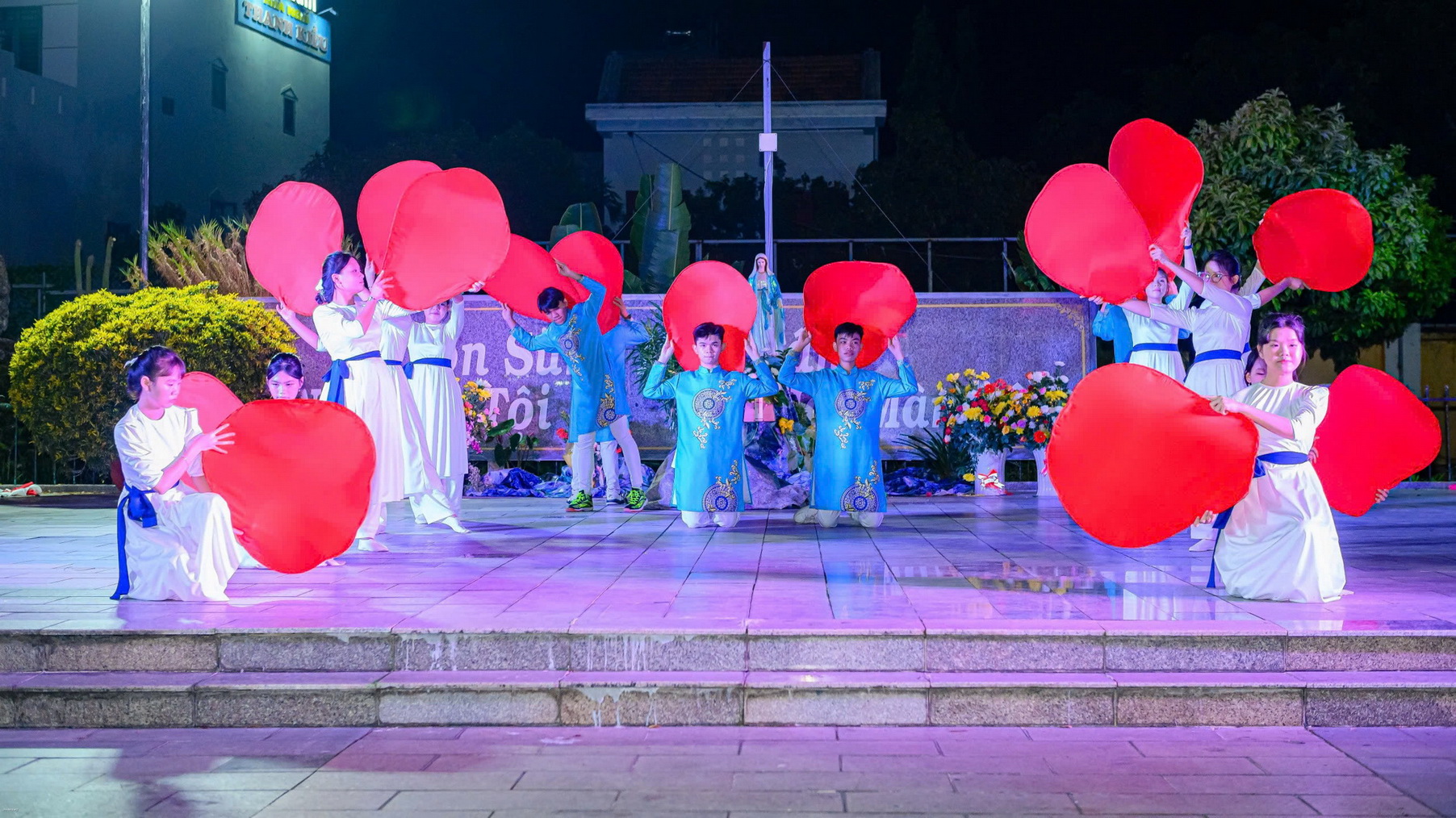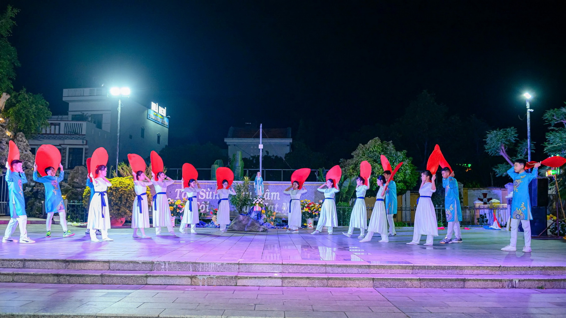 Sau lời khai mạc, đội múa dâng hoa thể hiện những vũ khúc tôn vinh Mẹ Maria: Chuỗi Ngọc Mân Côi, Tấu lạy Bà, Năm xưa trên Cây Sồi. Sau các vũ khúc, mỗi người cầm trên tay đóa hoa hồng cùng tiến dâng lên Mẹ trong tâm tình con thảo.