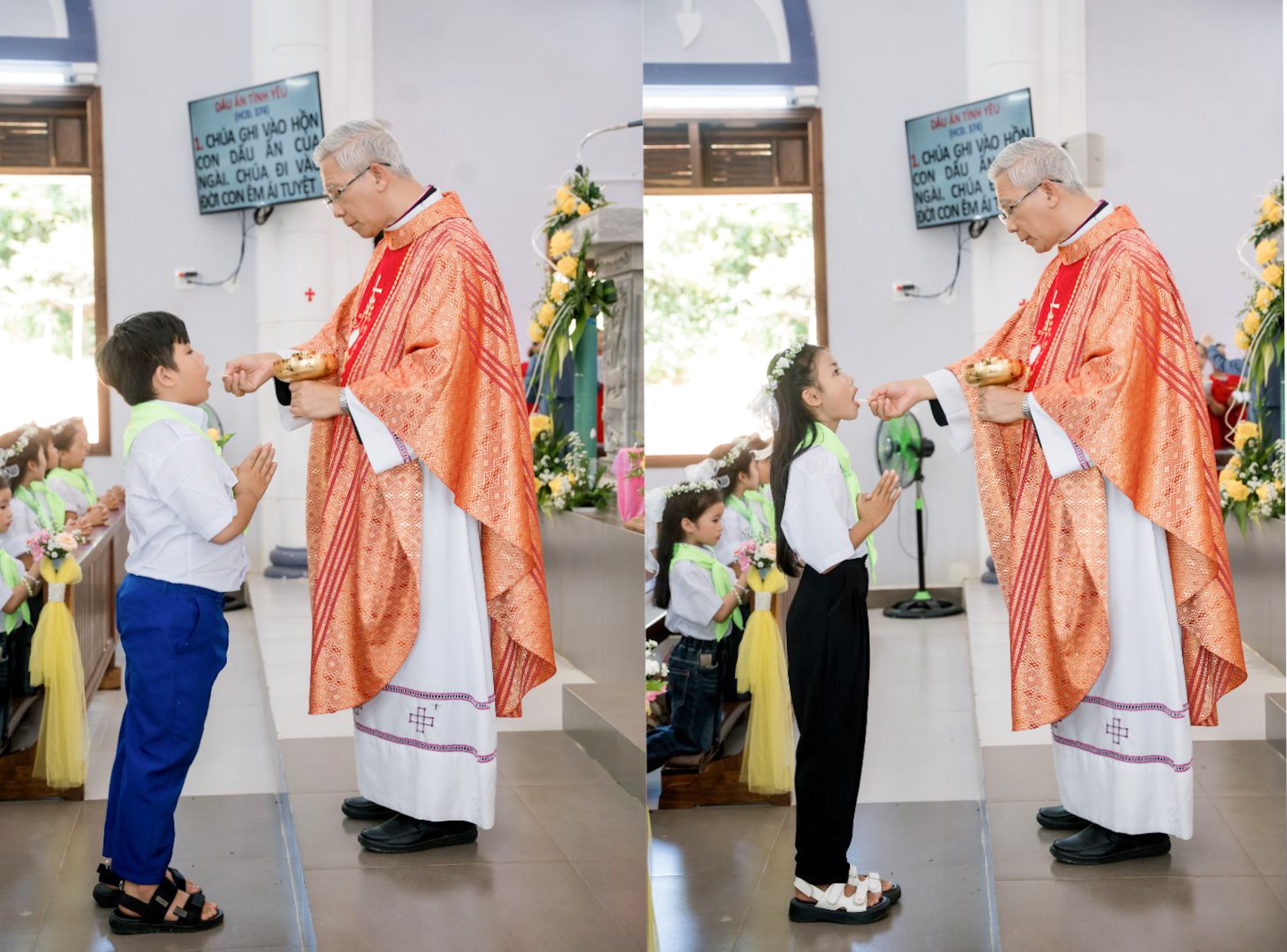 – Sau thời gian các em theo học các lớp giáo lý Thêm Sức và Rước lễ lần đầu, với sự đồng hành của cha quản xứ, quý giáo lý viên và sự nâng đỡ từ gia đình, hôm nay trong Thánh lễ có 17 em thiếu nhi đã lãnh nhận Bí tích Thêm Sức và 21 em được Rước lễ lần đầu.